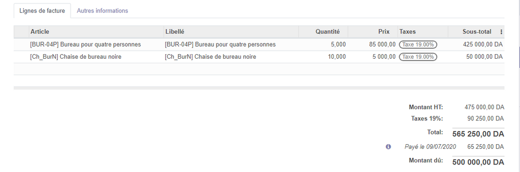 Dans le cas ou le paiement de facture est total, la facture sera affichée comme payé (en vers) .