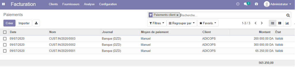 Liste des payements clients :