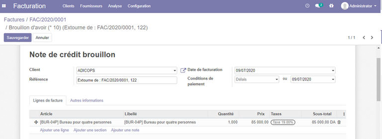 Par défaut la facture créé sera en mode brouillon , pour pouvoir créer les changements nécessaires, une fois terminée , cliquer sur le bouton comptabiliser.