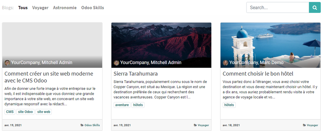 Le CMS Odoo vous aide à bien organiser vos articles et de faciliter l’abonnement des visiteurs à vos blogs, et vous aide également à écrire des articles conformes à des critères SEO (Search Engine Optimisation) , sans avoir connaissance de ces concepts, vous n’avez donc qu’à vous concentrer sur la rédaction du contenu de qualité.