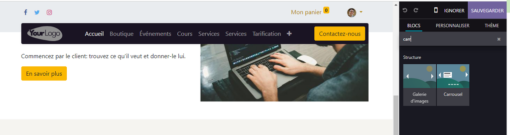 En allant sur l’application Site Web, puis en cliquant sur Editer à droite, un panneau de plusieurs blocs s’affiche et sera prêt à exploiter n’importe quel élément ou Widget.