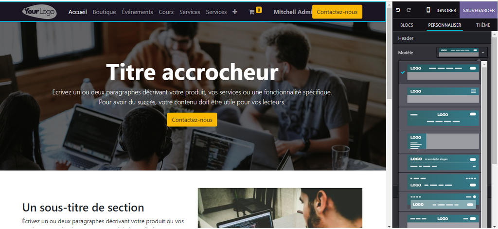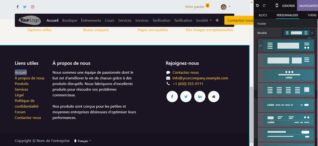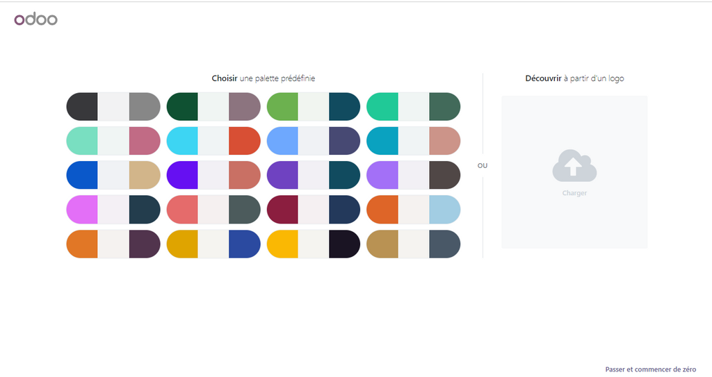 Odoo prend en considération votre choix pour concevoir votre site graphiquement selon les couleurs de la palette, ou les couleurs de votre logo.
