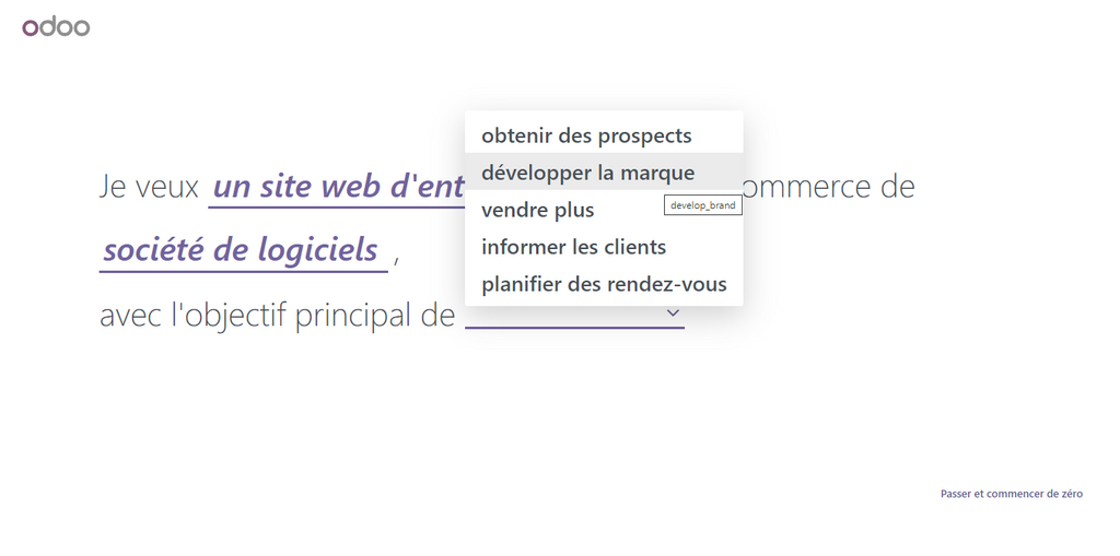 Remarque : Vous pouvez bien évidement ne pas suivre l’assistant Odoo pour créer votre site Web, en cliquant sur le petit bouton nommé passer et commencer de zéro, qui se trouve en bas de la page à droite, mais il est recommandé de suive l’assistant puisqu’il génère un bon résultat, dans un minimum de temps.