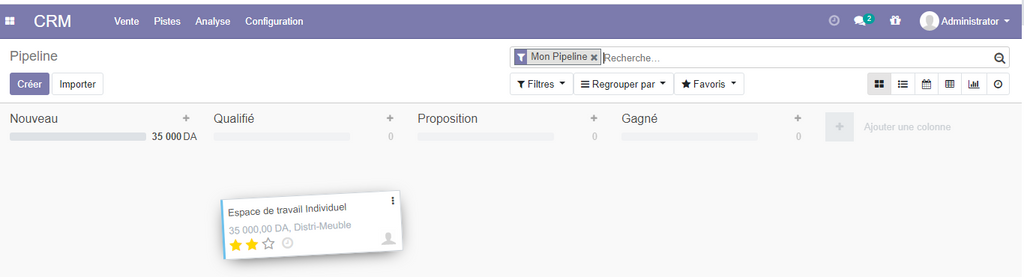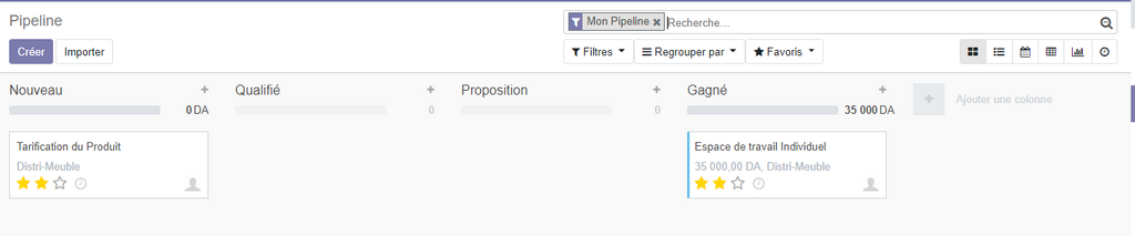 En cliquant dur l'application CRM, odoo affiche votre pipeline , qui permet de visualiser les différents opportunités avec leurs états d'avancement .