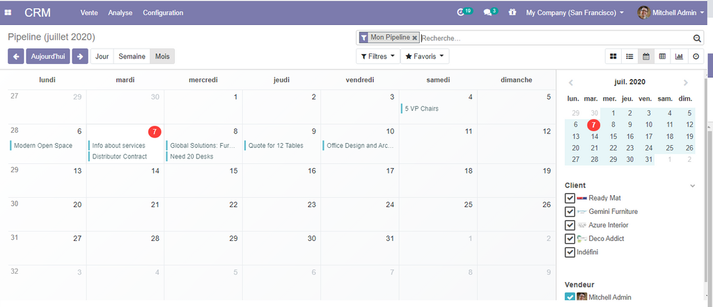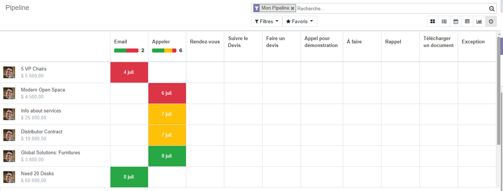 Afin d'avoir une meilleure visibilité sur votre pipeline et les différentes opportunités, et de pouvoir analyser toutes les activités relatives à vos client, odoo vous propose plusieurs vues.