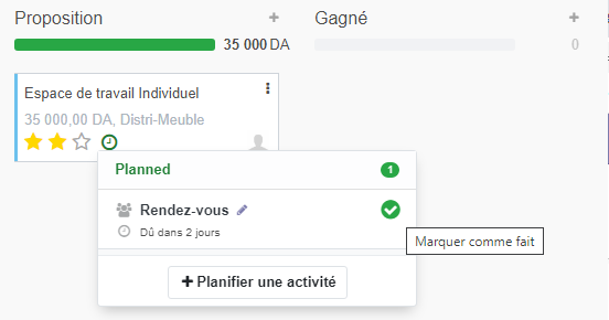 Marquer les activités comme fait : Dans le cas où vous avez terminé l'activité planifiée , cliquer l'icone de l’horloge en bas de l’opportunité, choisir l'activité que vous avez terminée , puis cliquer sur le bouton fait.