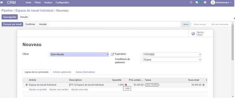 Ajouter un Devis à une opportunité : sur notre pipeline, cliquer sur l' opportunité Espace de travail individuel, dans le tableau de bord en haut à droite cliquer sur Devis pour ajouter un nouveau Devis.