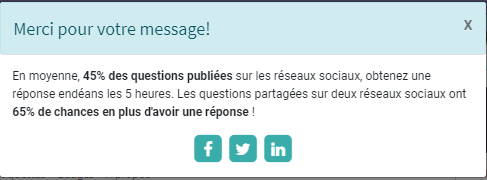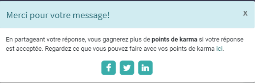 Vous pouvez partager les questions et les réponses sur les réseaux sociaux en cliquant simplement sur bouton publier, qui se trouve sous chaque réponse ou question.