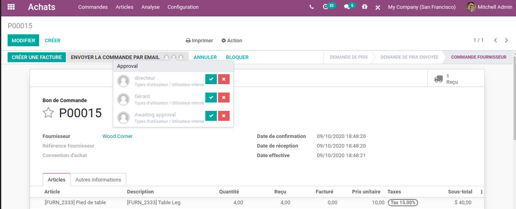 Iil est désormais possible de personnaliser le workflow selon les règles de votre entreprise ( les étapes de validations ou Approvals en Anglais) . par exemple lorsque le montant de la commande fournisseur est important ( supérieur à 5000 $ par exemple) , il faut ajouter d’autres étapes qui sont la signature du directeur d’approvisionnement + la signature du DG par exemple .