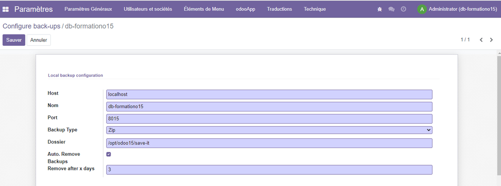 - Dossier : Précisier le chemein de dossier où vous allez sauvegarder les données , dans notre cas on va mettre le dossier créé précédement /opt/odoo15/save-it