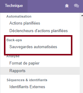 10-Maintenant et une fois le module installé, rendez vous sur Paramètres-> Technique et cliquez sur la nouvelle option : Sauvegardes automatisée pour configurer notre sauvegarde