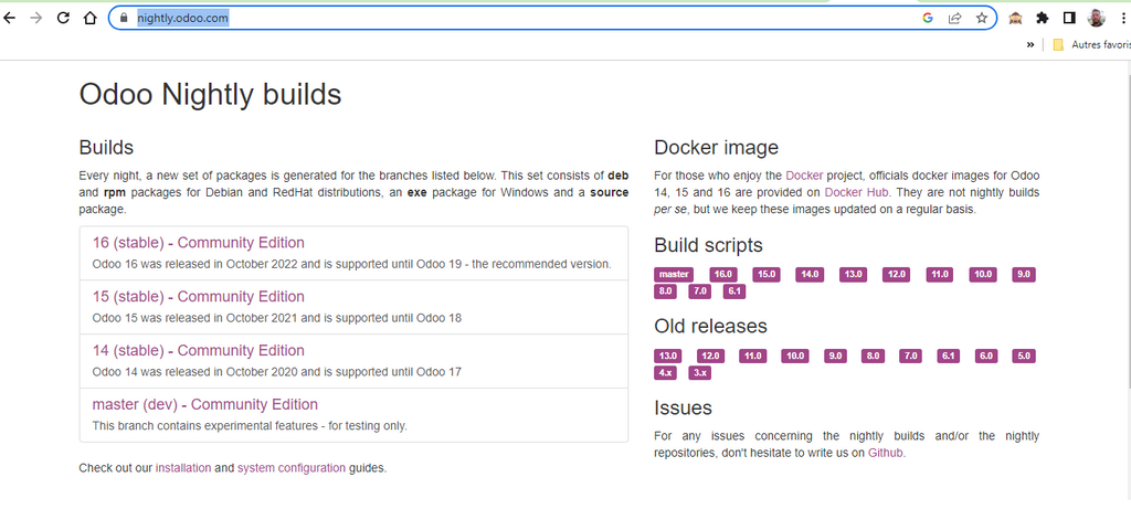 Afin de s’assurer que vous êtes entrain d’installer Odoo la dernière version, allez sur le lien officiel suivant: https://nightly.odoo.com/