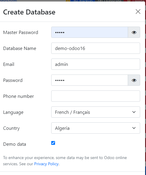 b. Database name : Introduisez un nom à votre base de données (odoo-16-demo par exemple)