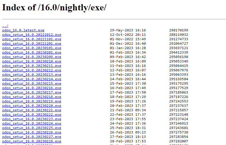 4- Dans la liste qui s’affiche, cliquer sur le lien de dernière version (odoo_16.0. latest), et attendez jusqu’à la fin de téléchargement du fichier
