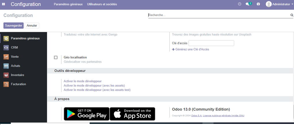 Pour afficher toutes les fonctionnalités de comptabilité il faut , tout d'abord activer le mode développeur d'odoo, pour se faire rendez vous sur le menu configuration et en bas de page , cliquer sur activer le mode développeur .