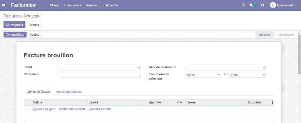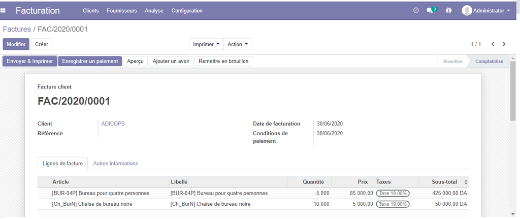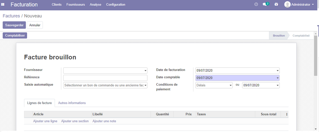 Par défaut la facture créé sera en mode brouillon , pour pouvoir créer les changements nécessaires, une fois terminée , cliquer sur le bouton comptabiliser.