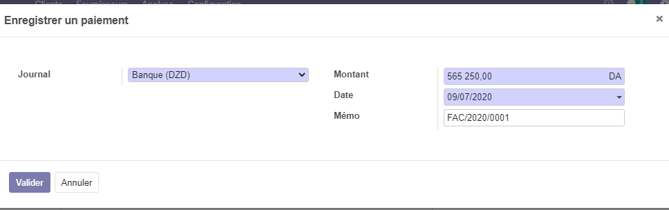 Dans la facture créé cliquer sur le bouton enregistrer un paiement . une fenêtre sera affiché pour saisir le montant payé.
