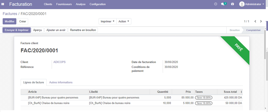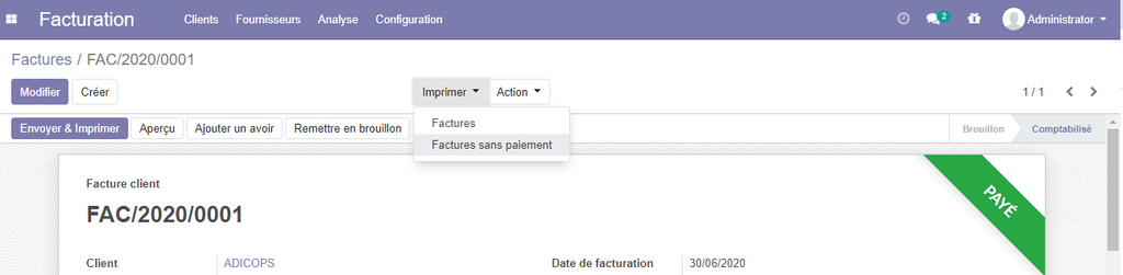 Dans le cas ou le paiement de facture est total, la facture sera affichée comme payé (en vers) .