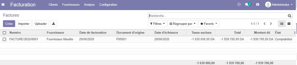 Création des Factures Fournisseurs : On peut créer des factures fournisseurs directement à partir du module de comptabilité, en cliquant sur le bouton créer , vous n'avez qu'à rempli les informations nécessaires puis cliquer sur comptabiliser Les factures peuvent être générées aussi directement ou à partir des commandes fournisseurs.