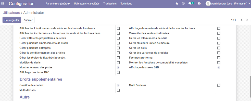 Dans la liste des utilisateurs cliquer sur l’utilisateur que vous êtes entrain d'utiliser , plusieurs options sont affichées pour donner ou pas le droit d'accès à une fonctionnalité particulière.