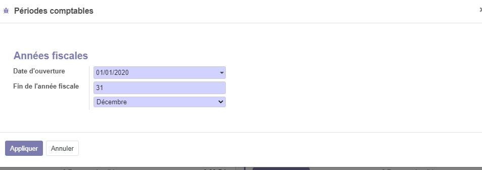Période comptables : Cliquer sur le bouton Configurer pour configure le début de l'exercice comptable et la date de clôture.