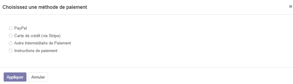 Configurer les modes de paiements . Pour Configurer les modes de paiement , rendez vous sur le module Facturation(Comptabilité) puis sur cliquer sur configuration ensuite sur modes de paiement , odoo vous affiche une liste par défaut , vous pouvez ajouter d'autres modes de paiement.