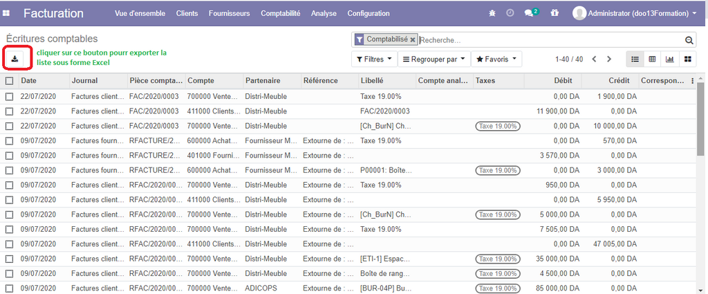 une liste sera affichée montrant tous les écritures que vous pouvez les exporter sur excel.