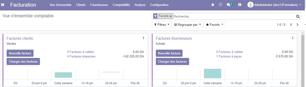 Vous aurez une vue graphique sur le chiffre d’affaire et les factures fournisseurs , et l'état de paiement des factures.