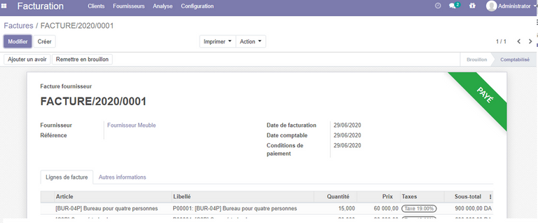 Une fois la facture établie, il est possible de gérer les payements fournisseurs , ou bien l'entreprise règle la totalité de la facture et la facture sera marquée comme payée, ou elle paye partiellement la facture.