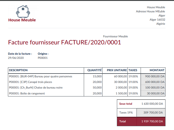 Pour créer la facture à partir du bon de commande fournisseur , Il suffit tout simplement de cliquer sur la commande fournisseur , puis cliquer sur le bouton créer une facture, la facture sera automatiquement créée. ( Consulter l’article gestion des achats pour plus de détailles..)