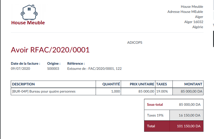 pour se faire il suffit de cliquer sur la facture dont vous voulez faire un avoir puis cliquer sur le bouton créer un Avoir client, un avoir sera créé vous pouvez l'imprimer l'avoir .