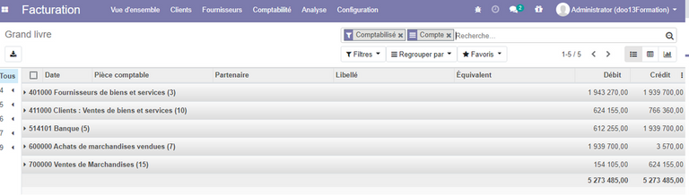 Le grand livre : Le grand livre inclut tous les journaux , pour l'afficher cliquer sur le sous menu comptabilité,pointer sur journaux puis cliquer sur le grand livre .