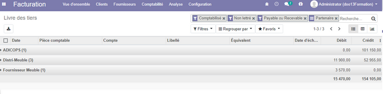Livre des Tiers : Le livre des Tiers permet d'afficher toute les opérations concernant les clients et les fournisseurs au même temps . pour l'afficher cliquer sur le sous menu comptabilité puis , journaux puis sur livre des tiers