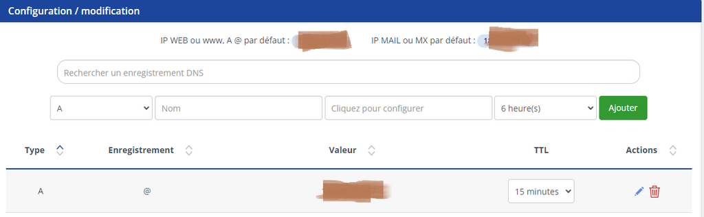 Allez dans l’enregistrement  @ de Type A (qui est généralement le premier enregistrement de la liste des enregistrements) , puis cliquer sur la petite icône sous forme de stylo pour modifier l’adresse où pointe notre domaine.