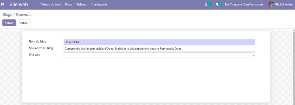 Dès l’installation du module Blog, Odoo ajoute, à la fin du menu principale, la page Blog qui va contenir nos blogs.