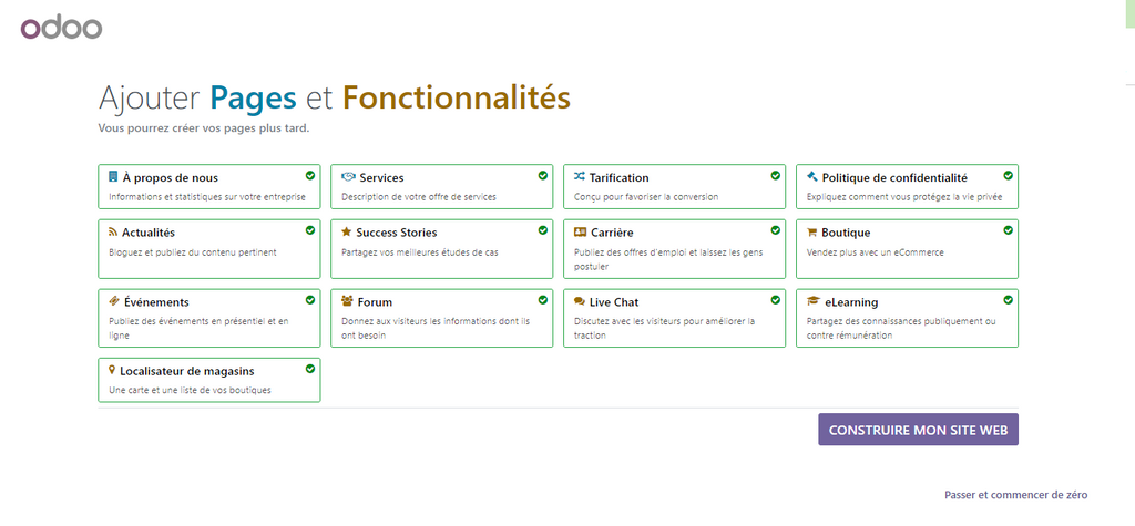 Remarque : Vous pouvez bien évidement ne pas suivre l’assistant Odoo pour créer votre site Web, en cliquant sur le petit bouton nommé passer et commencer de zéro, qui se trouve en bas de la page à droite, mais il est recommandé de suive l’assistant puisqu’il génère un bon résultat, dans un minimum de temps.