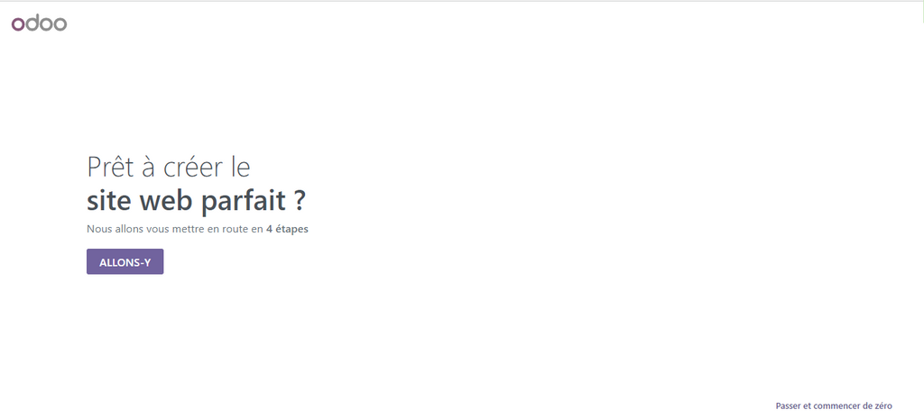 En activant l’application Web site, Odoo affiche immédiatement une page blanche contenant un bouton, qui vous propose à démarrer la création de votre site web en quatre étapes, Cliquez donc sur le bouton ALLONS-Y .
