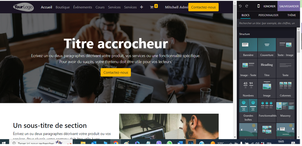 En plus, comme nouveauté de la version 16, il n’Ya pas une différence entre la parie backend, et la partie frontend, vous pouvez personnaliser votre site web, en étant toujours dans la partie backend.