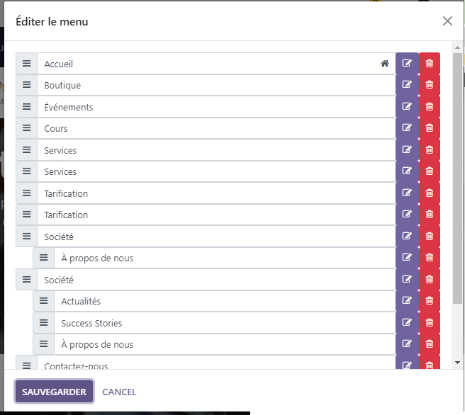 En cliquant sur cette icône, un pop-up sera affiché, vous permettant de personnaliser, changer l’ordre des éléments du menu, d’ajouter d’autres, ajouter une méga rubrique.