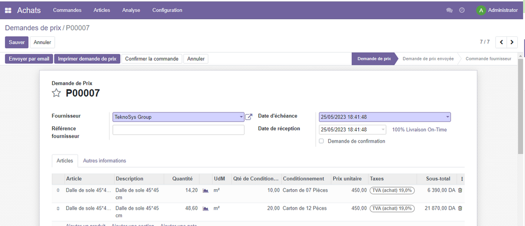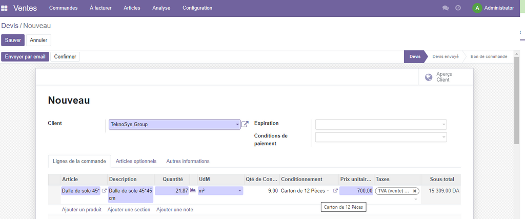 Vous remarquez que lorsque vous mette la quantité demandé (20 m²) et que vous sélectionnez le conditionnement Carton de 12 Pièces, Odoo vous affiche un message d’alerte vous indiquant qu’il faut mettre 21.87 m² pour qu’il se convient avec la sélection de l’emballage.