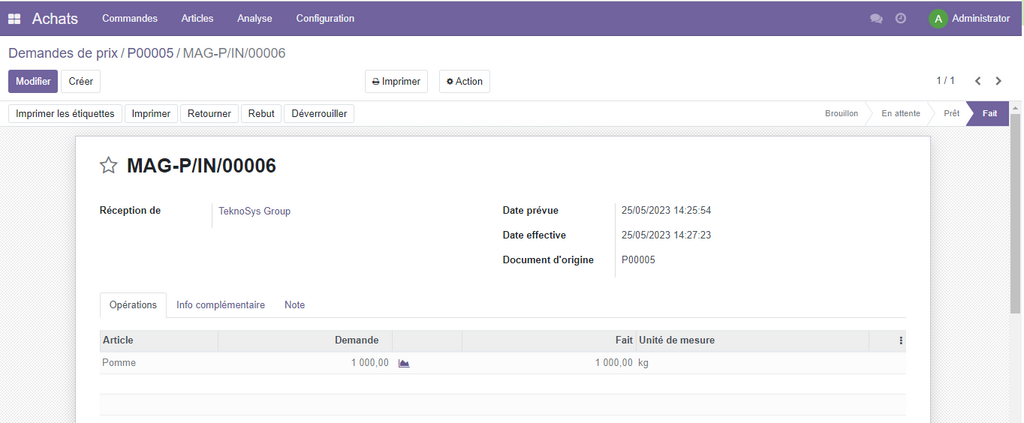 En mettant 10 Quintaux dans le bon de commande fournisseur, et après validation de la réception de stock Odoo va faire la conversion automatiquement en 1000 Kg, vu que le Kg est l’unité de mesure de base.