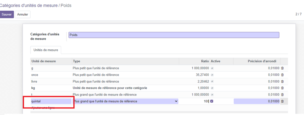Ajoutant par exemple un article qui est le fruit pomme et mettez Kg dans l’unité de mesure et Quintal dans l’unité de mesure achat.