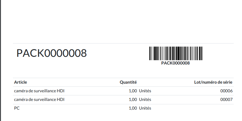 Cliquez ensuite sur le bouton Faire des colis se trouvant en bas du formulaire. En faisant ainsi Odoo créer automatiquement un Pack en lui affectant un numéro séquentiel (PACK0000008 Par exemple) contenant les deux caméras de surveillance et un PC .