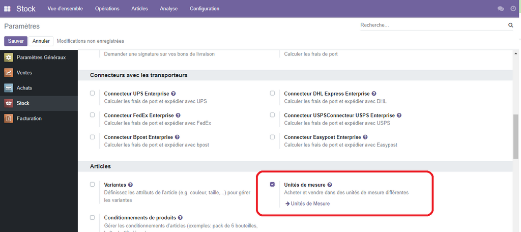 Pour activer les conditionnements d’un produit, allez dans le sous menu configuration de l’application Stock, puis cliquez sur paramètres.
