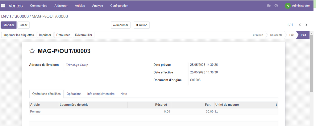 Par contre, dans l’opération de vente Odoo prend l’unité de mesure par défaut le Kg, et stock 30 kilo simplement de notre article Pomme.