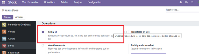 Pour activer les colis, rendez vous sur l’application stock, puis sur cliquez sur le menu configuration et enfin sur l’option paramètres.