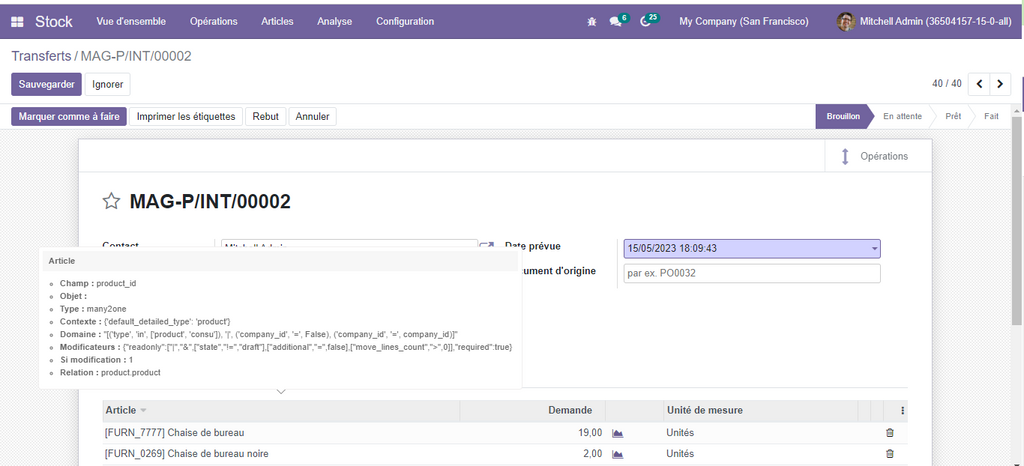 Choisissez ensuite l’opération transferts interner et désarchivez-la en cliquant sur l’option d désarchiver du bouton action, en faisant cela nous pouvons utiliser les opérations transferts internes dans l’entrepôt en question.
