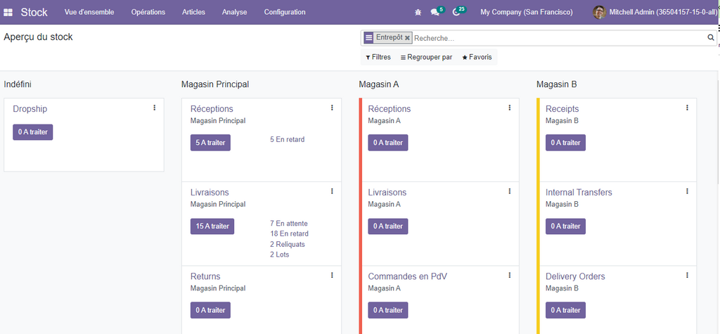 Le tableau de bord est maintenant plus clair, et vous pouvez visualiser clairement, chaque colonne représente un entrepôt avec les opérations qui marchent avec. (Pour l’onglet indéfinit représente l’option drop-shiping ou la livraison directe au client, qui fera l’objet d’un autre article).