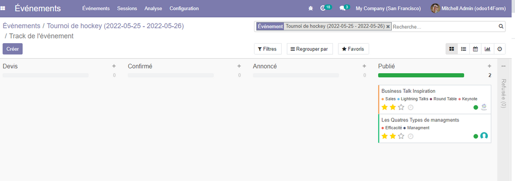 - Le bouton session : en cliquant sur ce bouton, vous serez amené à la vue Kanban qui permet de suivre les sessions d’un évènement. Par défaut chaque session, passe par quatre étapes (devis, confirmé, annoncé et publié).