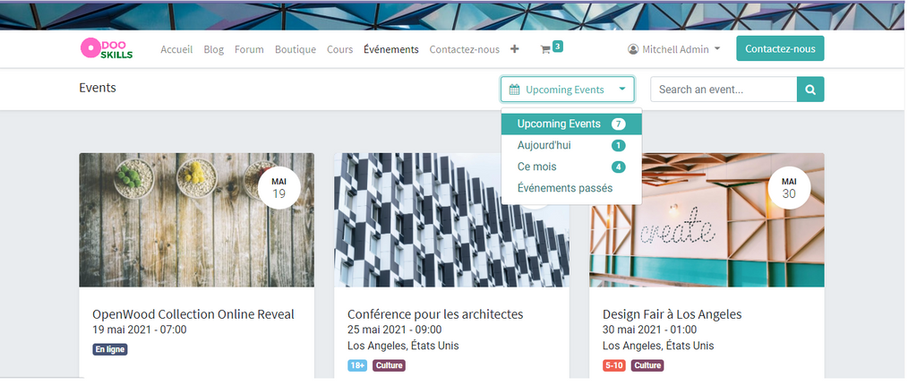 En étant sur votre site web, spécialement sur la page évènements, les visiteurs peuvent consulter tous les évènements que vous avez publiés, avec leur date de déroulements. Ils peuvent facilement repérer les évènements proches, les évènements qui se déroulerons ce mois, ou tout simplement rechercher un évènement particulier dans la barre de recherche des évènements.